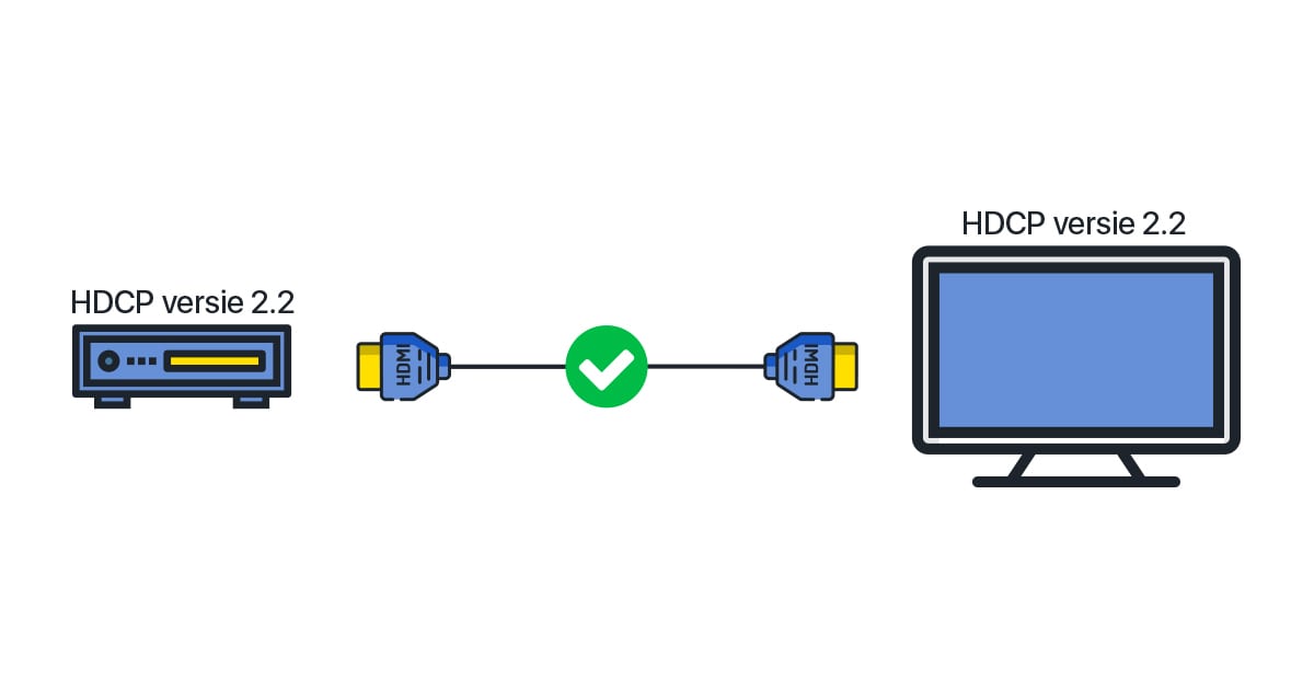 Ondersteunen beide apparaten HDCP 2.2 en krijg je toch een foutmelding of verlaagde resolutie? Controleer dan je HDMI kabels. Je hebt HDMI 2.0 (a/b) kabels nodig voor een correcte verbinding. Oudere HDMI 1.4 kabels bieden geen ondersteuning voor HDCP 2.2.